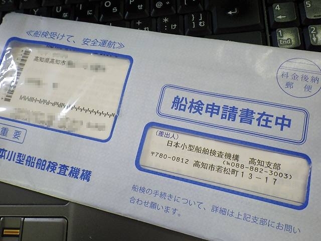 《 船検受けて、安全運行 》 船検申請書在中・・・とある。