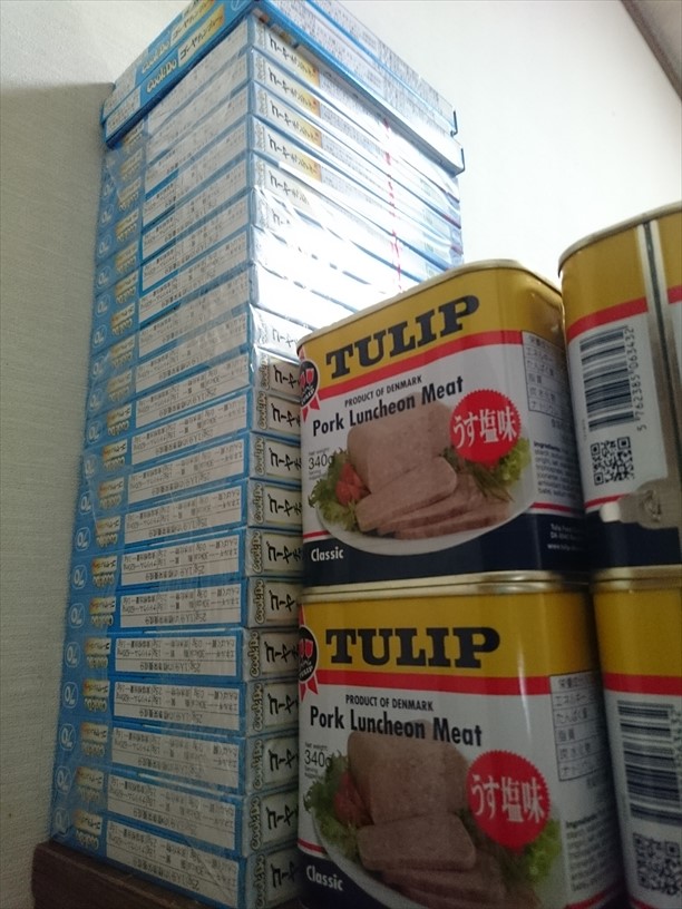 ランチョンミートとチャンプルーの素、山積みぃ~